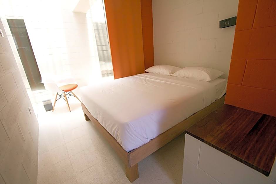 Modern rooms feature air conditioning, a queen-sized bed and a glass-box balcony overlooking the hotel's indoor courtyard. The private bathroom has hot/cold shower facility, towels and free toiletries.